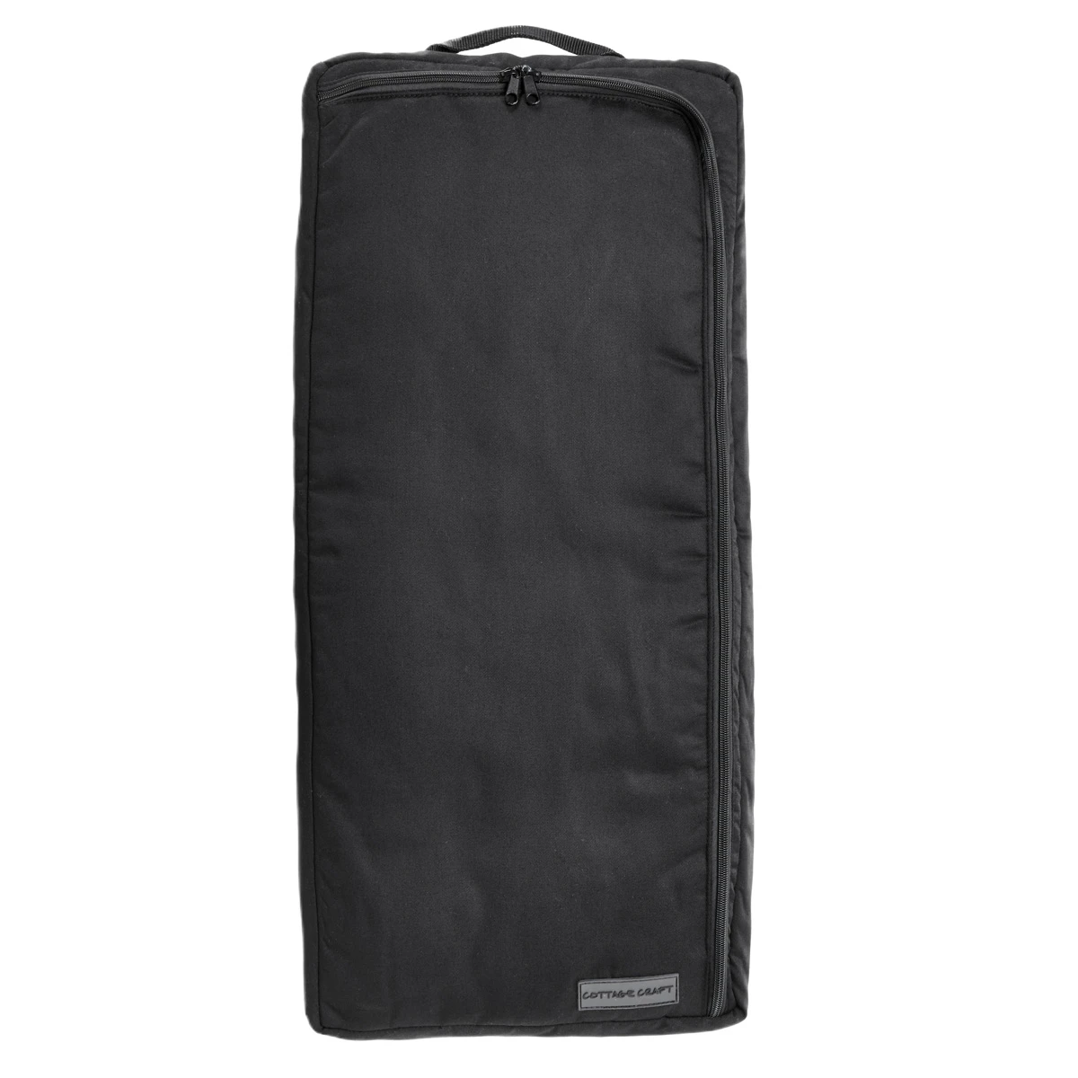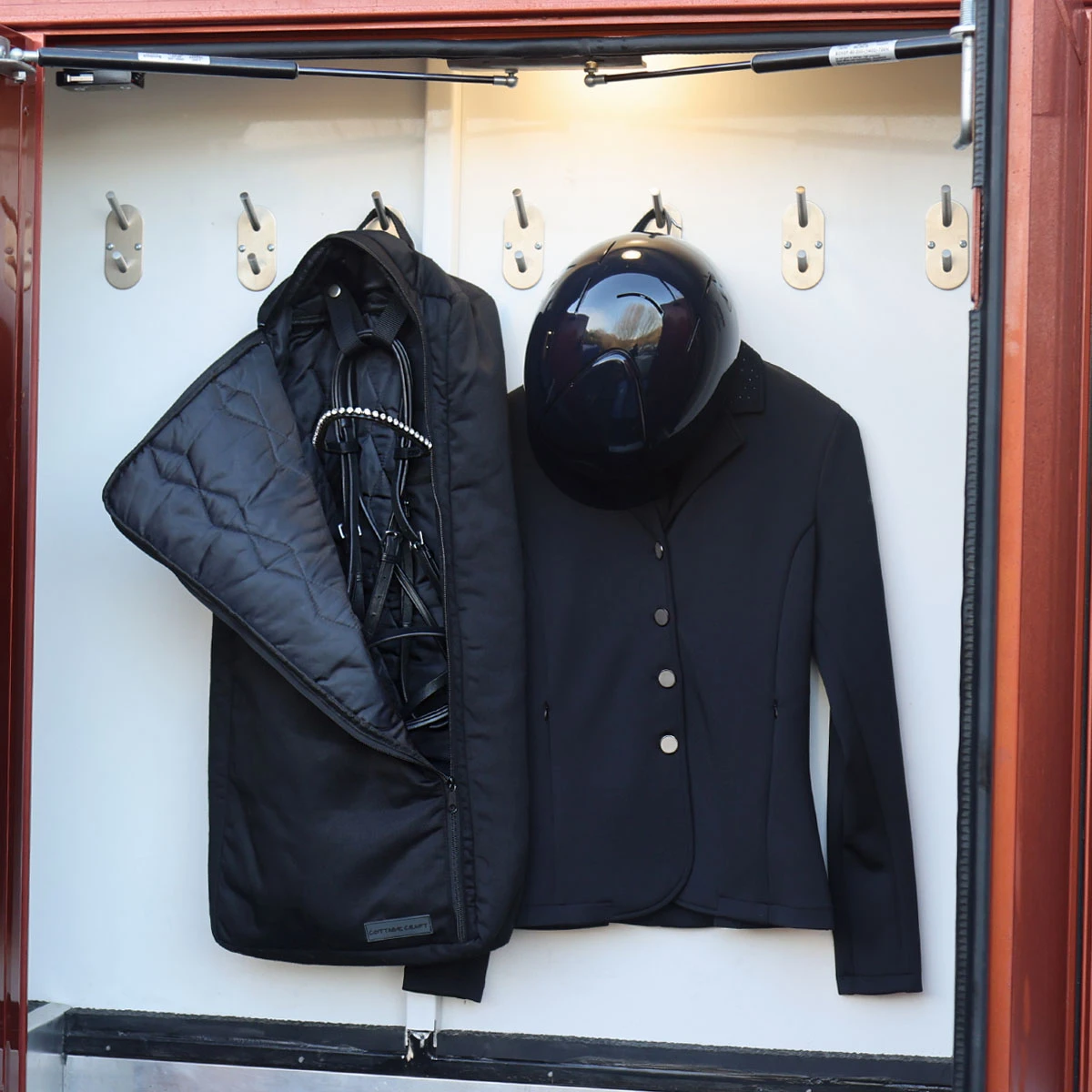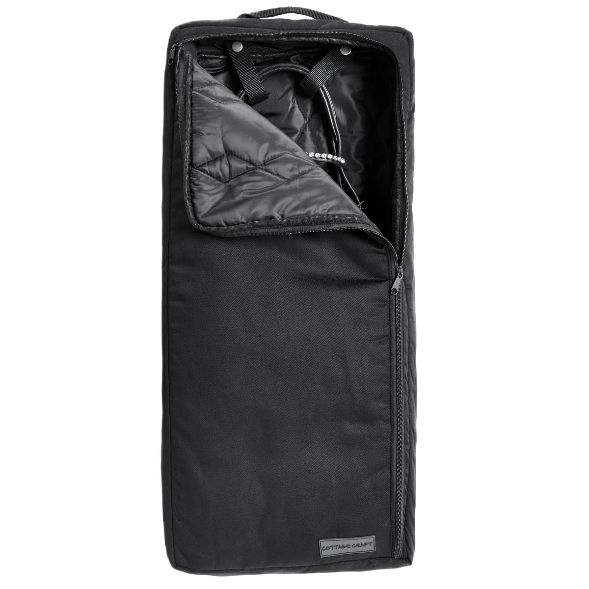 Safely enclose your bridle away to keep it clean and protected from scratches and knocks in our classy black quilted lined bridle bag. Brings ease of transportation of your bridle and multiple bridle accessories in one enclosed specially crafted carry bag. Designed with a carry handle, Cottage Craft woven rubber logo, strong durable two zip fastening and two internal press button loops for holding the bridles in place. This is part of our new Cottage Craft accessory range which includes a grooming kit bag, saddle cover and bridle bag.