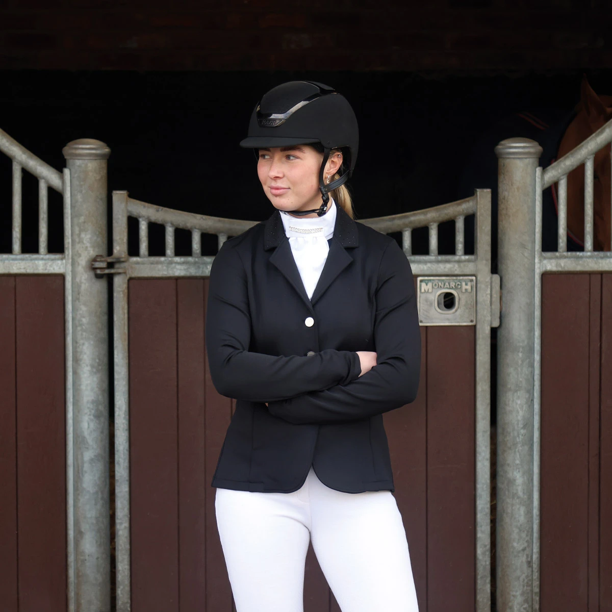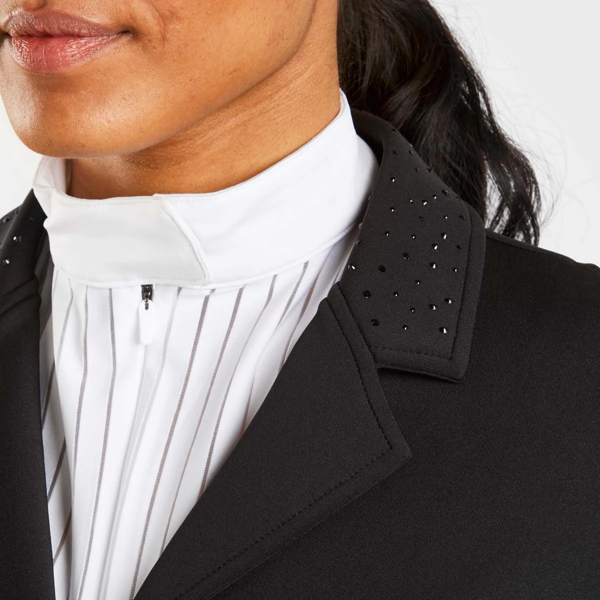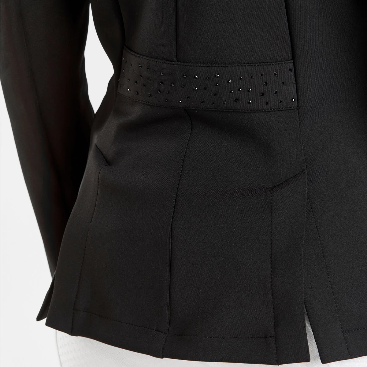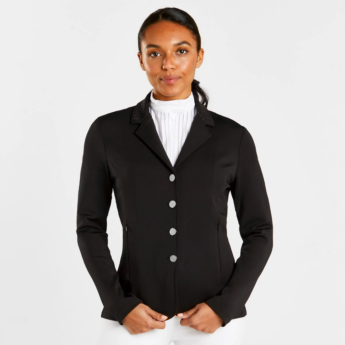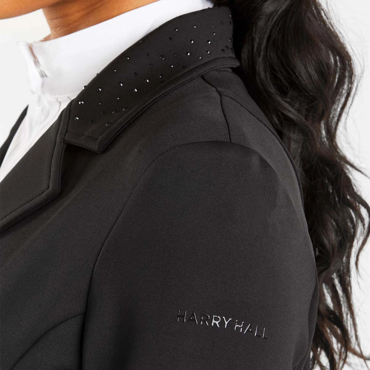 Beautifully tailored with elegant details, the Harry Hall Ladies Show Jacket has been designed to offer ultimate comfort for every rider in the show ring. The lightweight and highly breathable stretch fabric allows for great freedom of movement to ensure maximum comfort. The modern four-way fabric provides an unrestricted feeling in the saddle whilst also giving a flattering appearance when worn. The elegant crystal details to the collar and back waist band create the perfect amount of subtle sparkle for the show ring. Two front zip pockets make this a practical jacket and button front fastening for a stylish finish. Featuring subtle Harry Hall logo to the sleeve in a gloss finish.