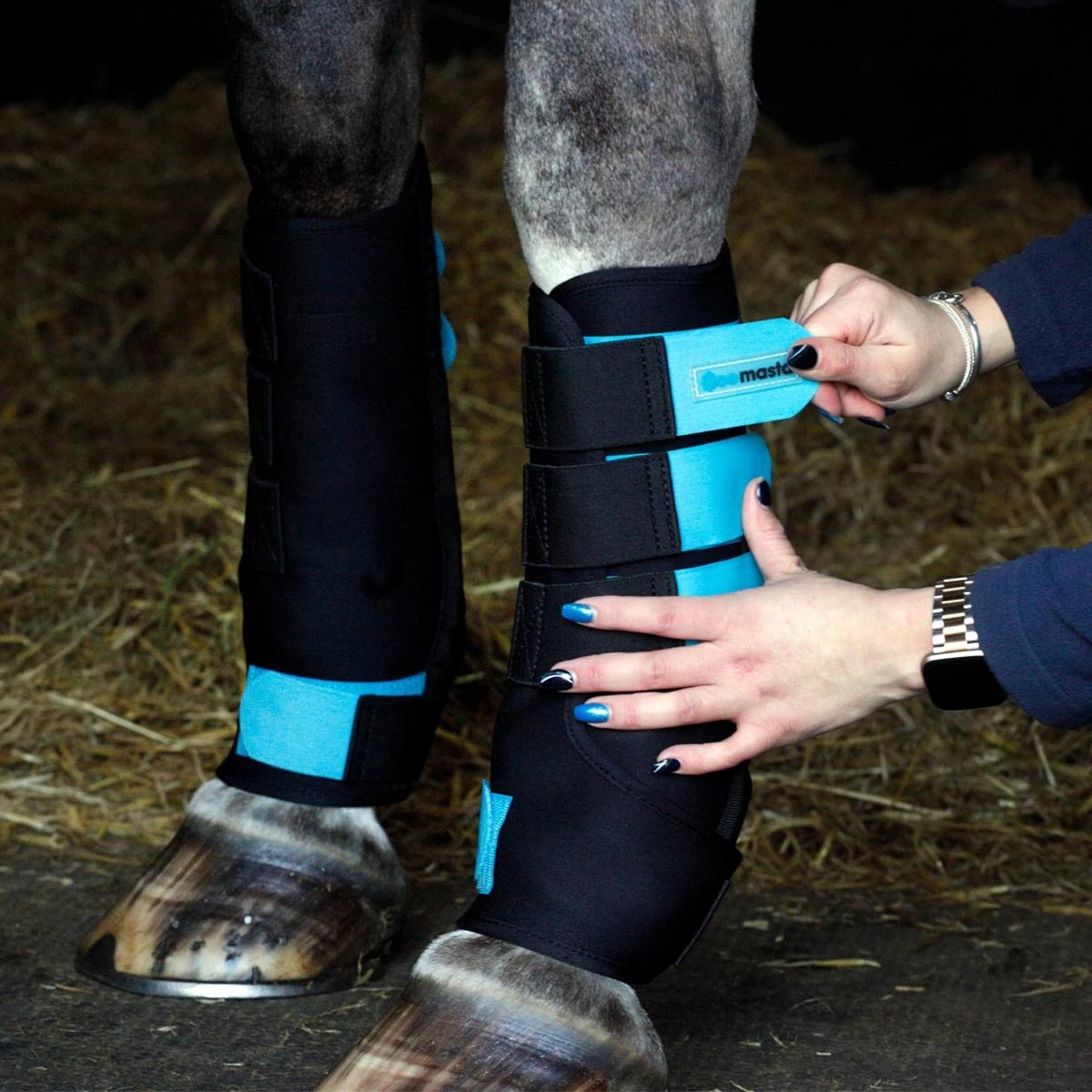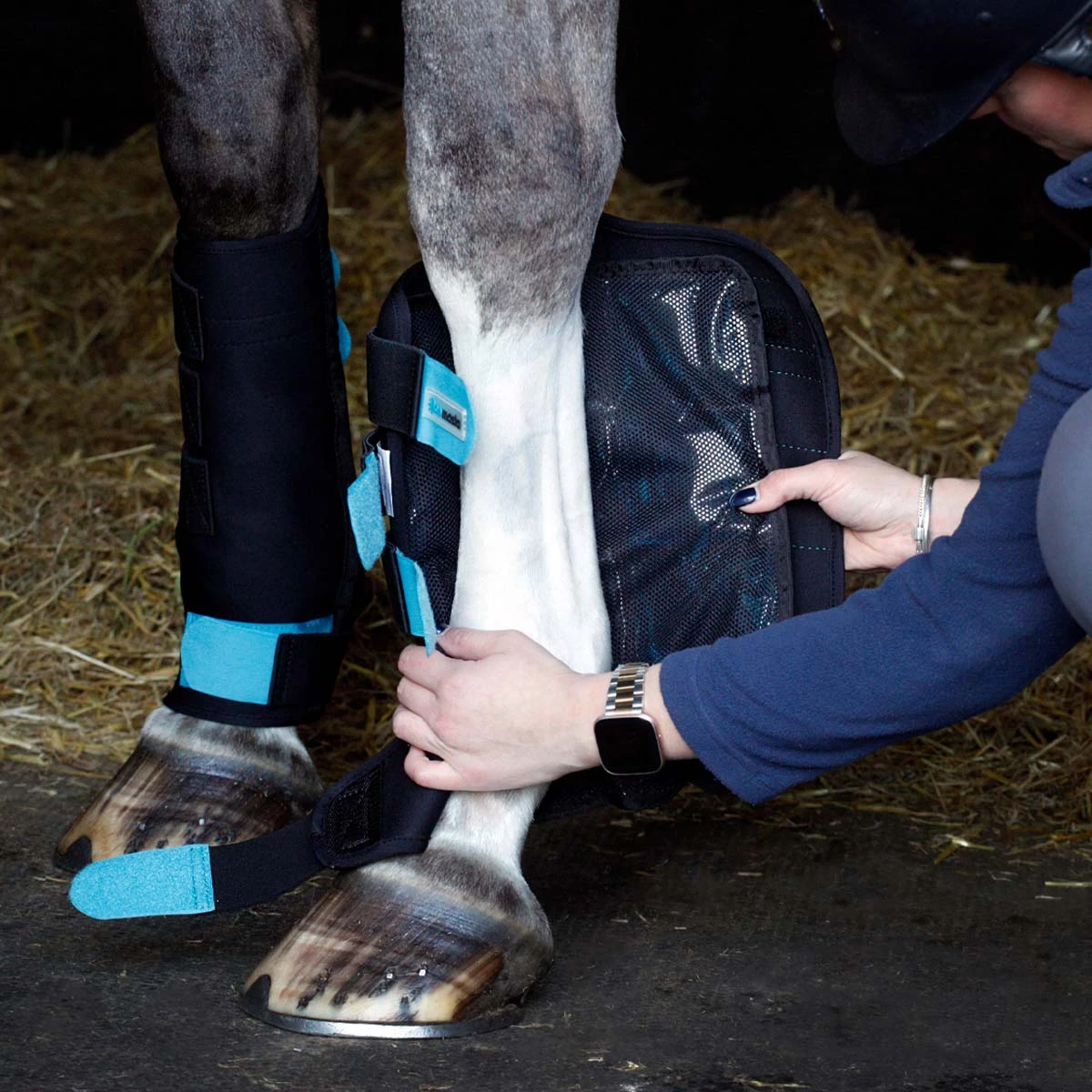 The Ice Masta Therapy Boots are ideal for travelling away to shows as well as everyday use on the yard, the gel packs can be kept flat in a cooler bag when away or in the freezer at the yard, home or even in the horsebox. The gel packs simply attach to the top of the boots by hook and loop fastening and sit neatly behind a soft mesh lining which protects the skin from freeze burn.