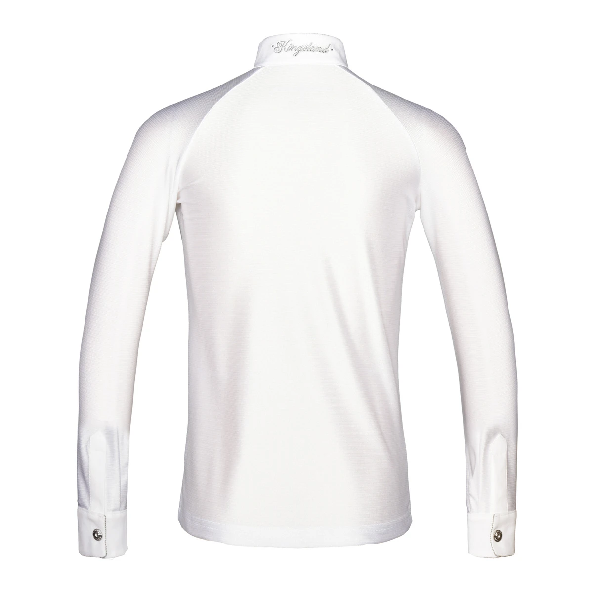 The Kingsland KLroselyn ladies long sleeve show shirt is functional, breathable and quick drying. It features a feminine fit with a shiny sleek body fabric making you feel centre stage in the competition ring without compromising high performance and focus. Other features include a woven collar, placket and cuffs with chain piping detail. Complete with snap button tape inside the placket and crystal snap button on the collar and cuffs. The Kingsland logo is placed on the back of the collar and subtle branding to the chest.