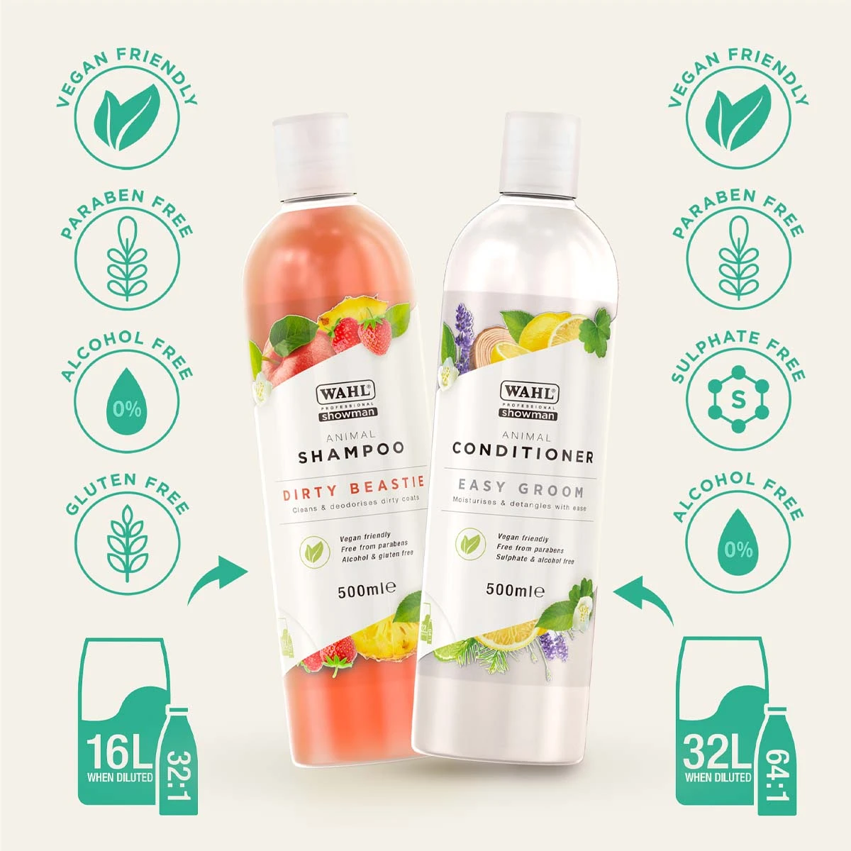 Preparation is key when clipping or trimming your horse, therefore included within the kit is Wahl’s Dirty Beastie Shampoo (500ml), Easy Groom Conditioner (500ml),  Stiff Bristle Body Brush and Equine Hoof Pick.
