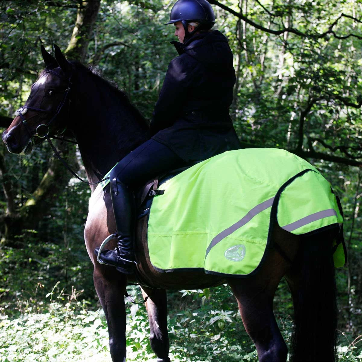 The Masta waterproof quarter sheet is made from durable 600 denier ripstop and lined with a warm polar fleece. Designed to sit neatly behind the saddle and attaches easily to the girth or stirrup straps with loop fastenings with a buckle clip. The fluorescent yellow colour makes this the perfect choice for adding extra visibility when out on the roads along with great features such as the reflective strips, reflective piping and badge for safety when out hacking. Comes with fillet string.