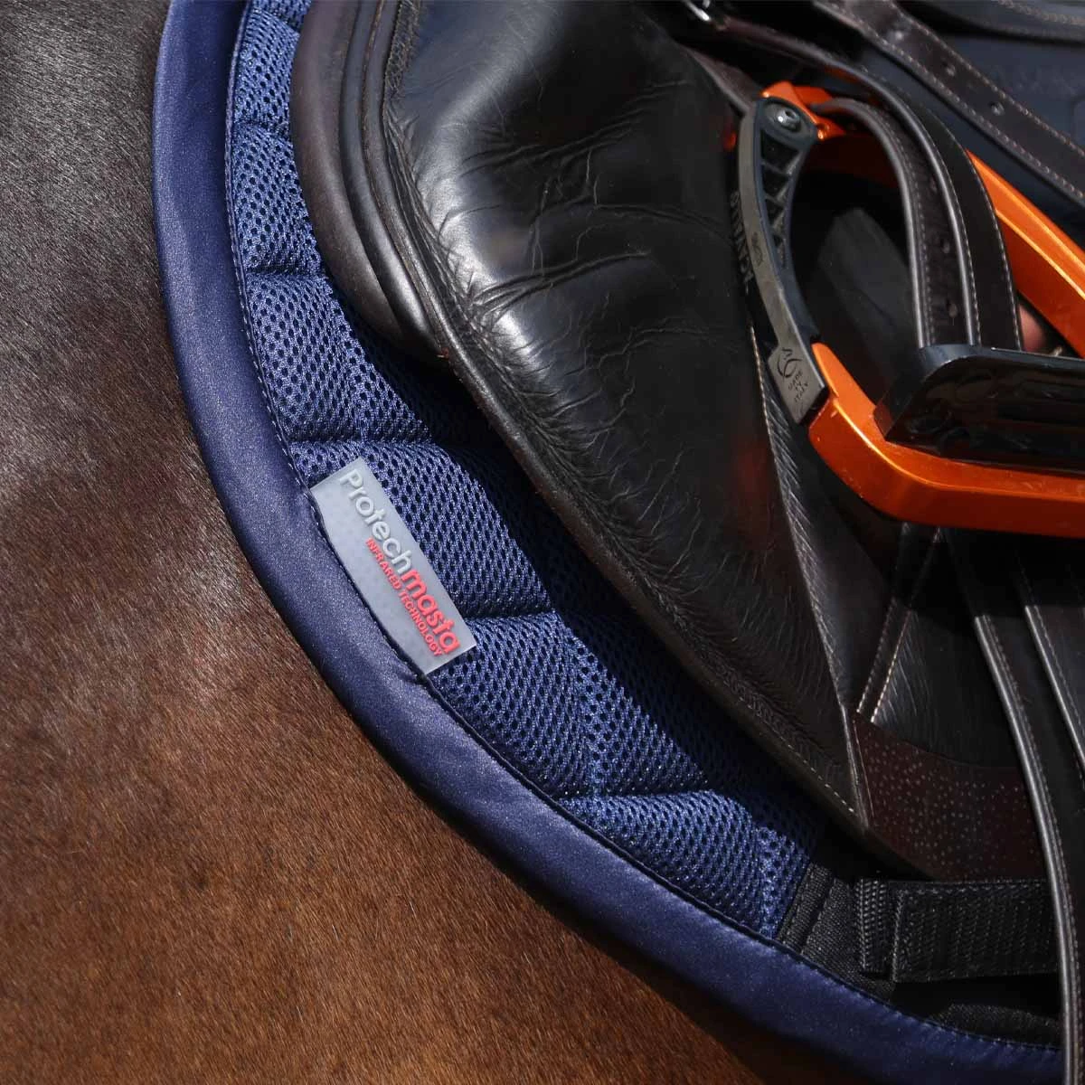 Part of the Protechmasta collection, the Protechmasta Airmesh GP Saddlecloth combines naturalistic ceramic infused FIR lining with 3D airmesh outer and satin binding to create a luxurious high-end finish. Hook and look D-ring straps to secure to the saddle and dual option girth loops. Reinforced girth patch for added durability. The quilted design using breathable 3D airmesh makes this saddlecloth extremely lightweight and breathable, combined with FIR lining to help increase circulation over the back.