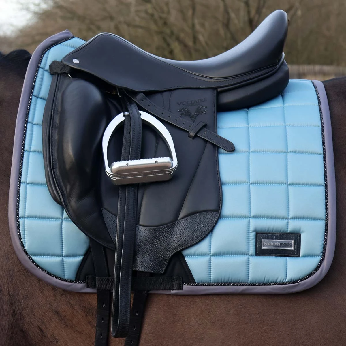 The Protechmasta LUX Dressage Saddlecloth, a beautiful new design to fit straight cut and dressage saddles. It’s sleek cut away design is partnered with a shiny outer material which is not only beautiful but dirt repellent too. The rope detail in black with silver glitter backing to the Protechmasta badge creates a luxurious high end finish.