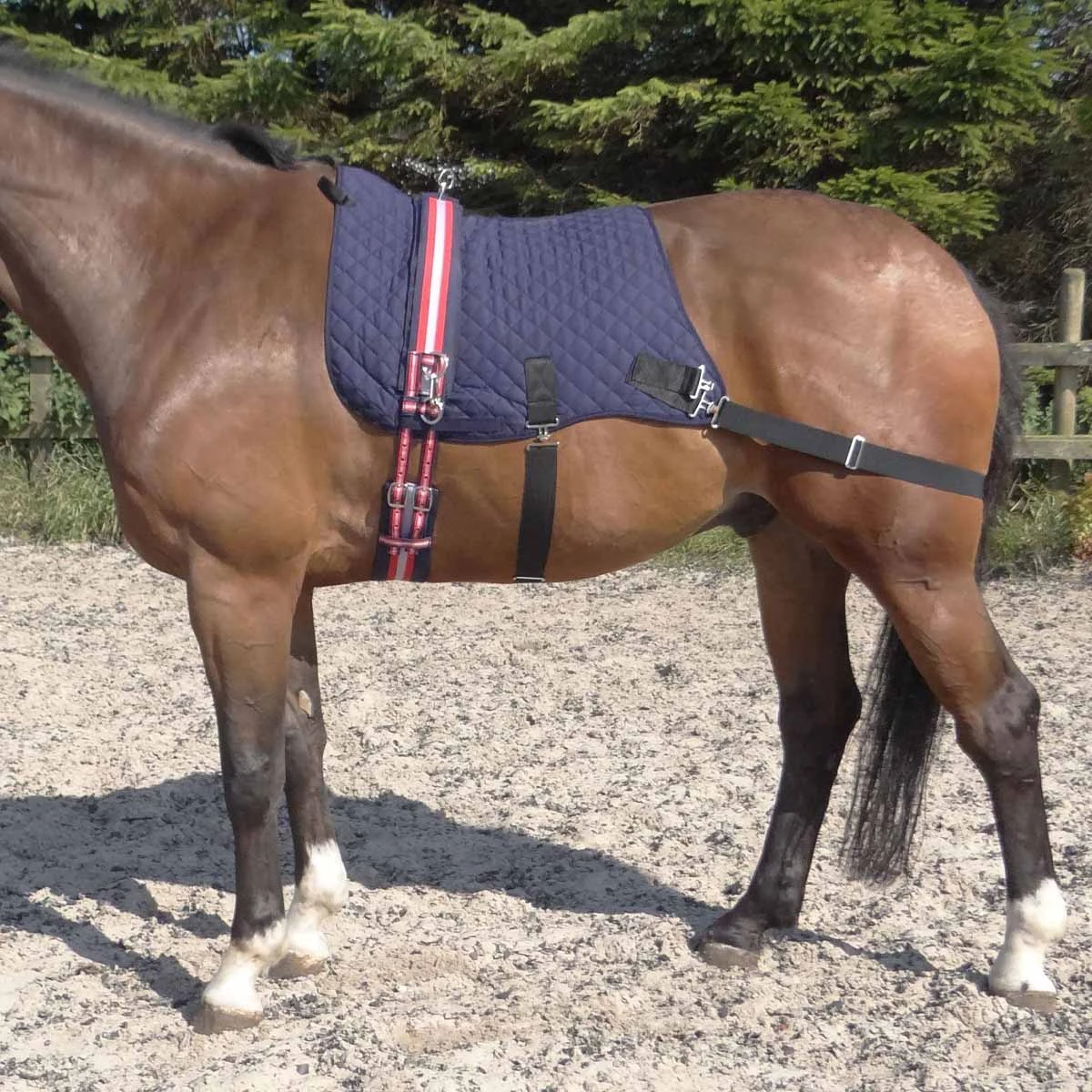 The Pro-Core Trainer is a training aid designed from a numnah based system with two bands that are secured behind the hindquarters and around the abdomen. The bands stimulate receptors in the hair and skin to recruit the underlying musculature of the core stabilisers. The abdomen band is used to help encourage flexion and better posture through the back. The hindquarter band is used to aid hindquarter muscle development and encourage equal stepping of the hindquarters. Working together both bands help to encourage engagement of the core and hindquarter muscles.