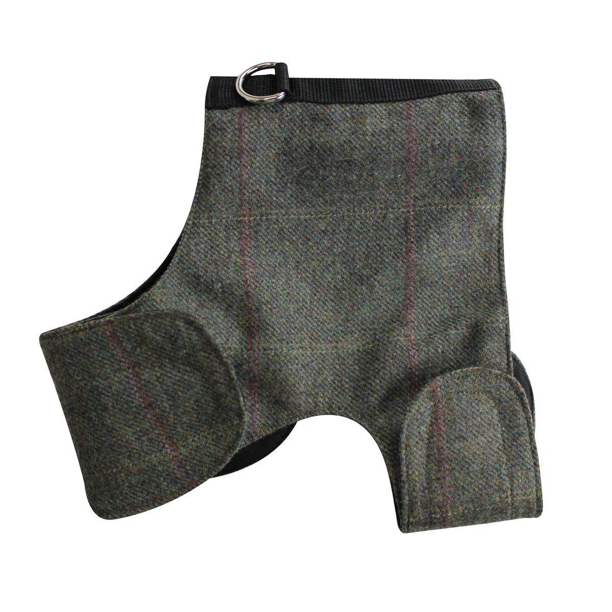 The stylish luxury dog harness is easily adjustable featuring hook and loop chest and neck fastenings to ensure a secure fit. Quickly attach your dog’s lead to the D ring located on the back of the harness and you are ready to go! Handmade in the UK using British fabric, the green tweed features a faint pink and red check running through the fabric.